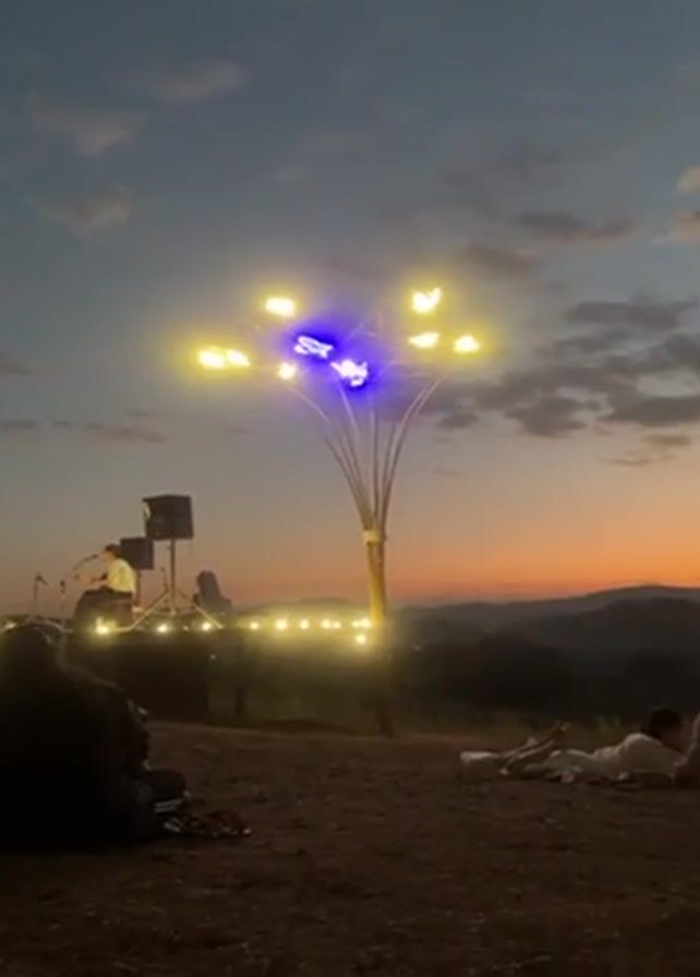 musical performance taking place outdoors, likely on a hilltop, as indicated by the view of mountains and a city visible in the distance at dusk. A singer stands on a makeshift stage with speakers, while several people sit on the grass, facing the stage and singer. A decorative light structure resembling a tree with multiple branches and lights, stands prominently to the right of the stage. The sky is in the midst of a sunset, showing various shades of orange and blue. The mood appears relaxed and peaceful.