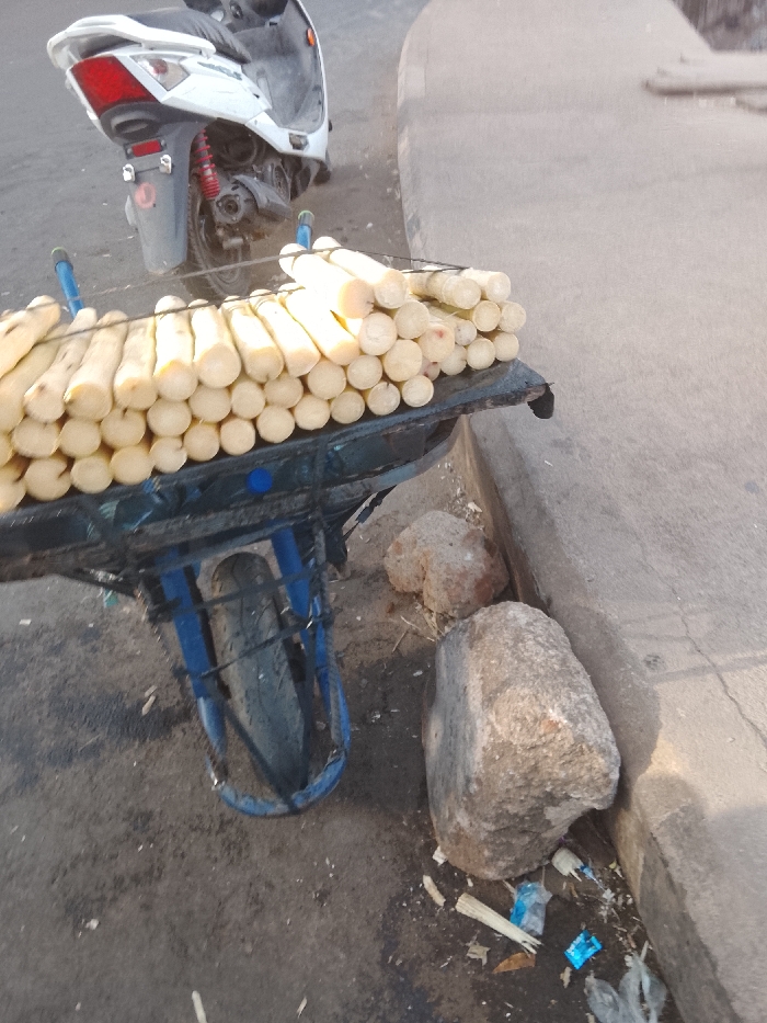 This image depicts a roadside scene in Jos, Nigeria. In the foreground, a blue-painted metal cart, resembling a modified wheelbarrow, is laden with numerous peeled sugarcane stalks. The sugarcane is uniformly cut into cylindrical, light beige pieces, stacked horizontally on the cart's dark top surface. A single wheel of the cart is visible at the bottom of its blue frame. To the right of the cart, two large, irregularly shaped greyish-brown rocks rest on the dark, unpaved ground, adjacent to a concrete curb. Scattered among the rocks and by the curb are small pieces of discarded sugarcane and various plastic debris, including a blue wrapper. In the upper background, a white motor scooter is partially visible on a lighter paved surface, showcasing its rear fender, red taillight, exhaust pipe, and exposed red suspension spring. No individuals are present in the frame.