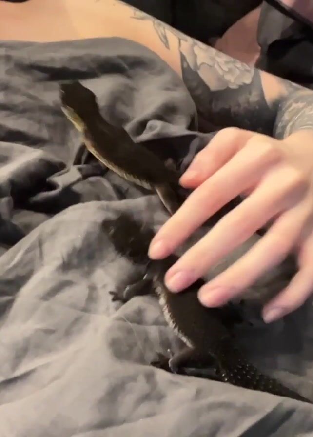 A person with a tattooed arm is lying under gray bedding with two black lizards resting on top. The person's hand gently moves one of the lizards. The person's bare chest is visible.