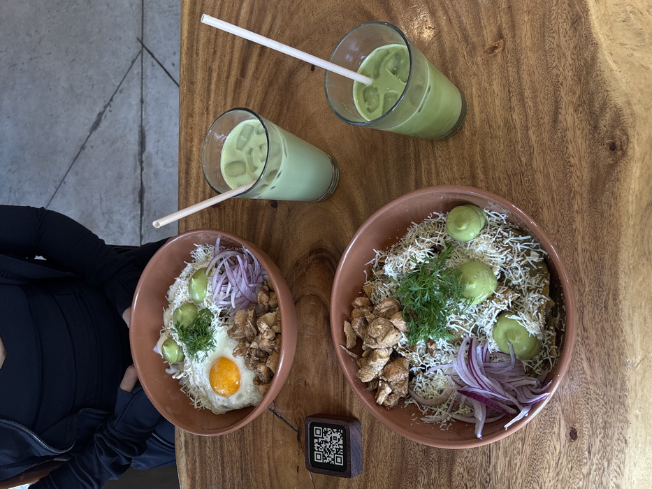 The image displays a meal set on a live-edge wooden table in a dining establishment located in Puebla City, Mexico. A person, wearing a dark long-sleeved top, is partially visible in the upper left quadrant. Two terracotta-colored ceramic bowls dominate the foreground, each containing a meal. The upper bowl features a sunny-side-up fried egg, fried pork pieces, shredded white cheese, thinly sliced red onion, three dollops of light green sauce, and a sprig of dill. The lower bowl contains similar components, excluding the egg, but with a more prominent portion of shredded white cheese, fried pork pieces, red onion, three dollops of light green sauce, and a dill sprig. Two clear glasses, each with a light-colored straw, contain a light green iced beverage. A small square wooden block with a black QR code is situated on the table to the left of the upper bowl. The background reveals a light-colored concrete floor with visible seams.