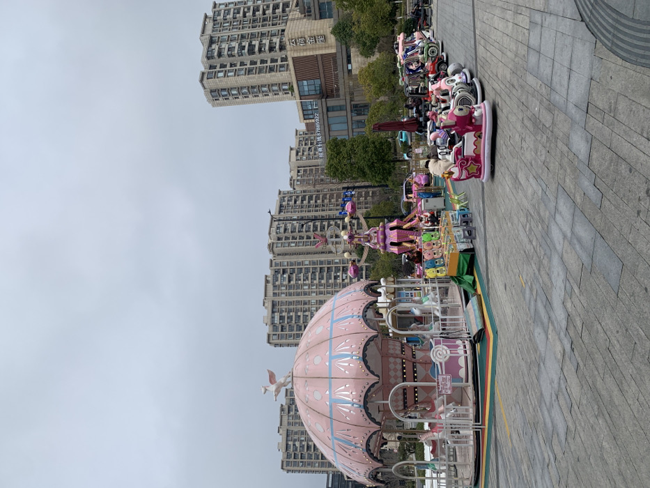 The image depicts an outdoor urban plaza in Xihu District, Hangzhou, Zhejiang, China, specifically adjacent to the Yunqi Jinzuo (云栖金座) commercial and residential complex, which is identified by signage on a background building. The sky is uniformly overcast. The plaza floor is paved with gray interlocking concrete pavers, featuring yellow and red/green striped ground markings. In the foreground and midground, a small amusement area is present. On the left, a large, pink and white mushroom-shaped carousel with blue accents stands stationary. It features multiple white carousel horses and carriages, and a white winged unicorn figure adorns its dome. Adjacent to the carousel is a small green and yellow game stall displaying various plush toy prizes, with several small colorful plastic chairs positioned in front. To the right of the game stall, a pink and purple spinning amusement ride, resembling a mini Ferris wheel, is visible, with at least one individual occupying a gondola. Further to the right, a row of approximately ten brightly colored, stationary electric or coin-operated kiddie rides is arranged on the plaza. These include various cartoon-themed vehicles such as cars, motorcycles, and a pink train-like ride. One individual, dressed in a light-colored padded jacket, is seated on the front pink train-like ride. Other indistinct figures are present near these rides. In the background, multiple modern, multistory residential or commercial buildings dominate the skyline, including the building displaying "云栖金座" and "招生热线: 57885922". Sparse trees and streetlights are visible throughout the background. A red umbrella canopy is also present in the midground-right. No dynamic actions of the rides or intense interactions among people are explicitly depicted; the scene appears largely static with individuals passively present or seated on rides.