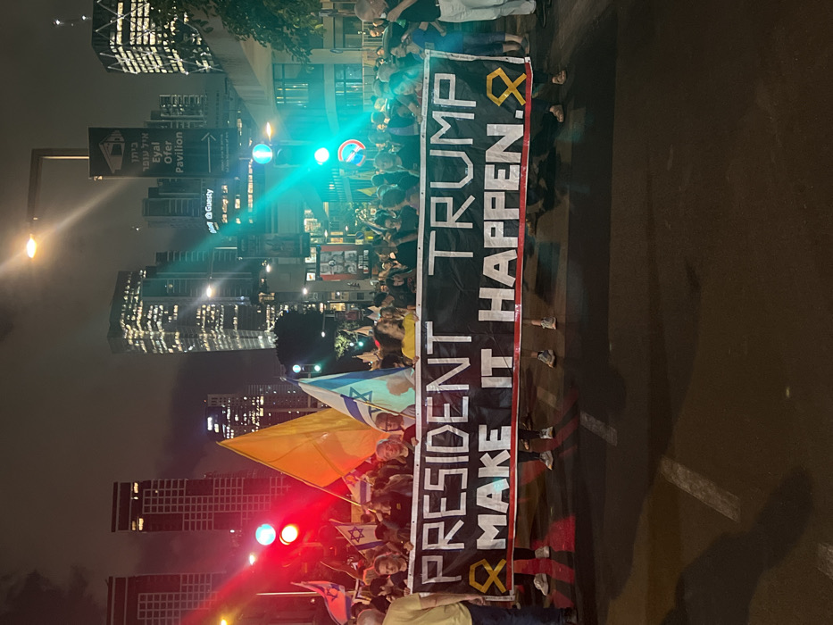The image captures a nighttime street scene in Tel Aviv, Israel, specifically on Sderot Sha'ul HaMelech, near the Tel Aviv Museum of Art's Eyal Ofer Pavilion, as indicated by a directional street sign on the right. A large group of individuals, predominantly adults, are gathered on an asphalt road. In the foreground, a prominent black banner with white capital lettering is held horizontally by approximately five individuals. The banner reads "PRESIDENT TRUMP" on the upper line and "MAKE IT HAPPEN." on the lower line, with yellow ribbon symbols flanking the lower text on both ends. Numerous Israeli flags are visible throughout the crowd, some held aloft, and at least one large, plain yellow flag is also present. The background features several illuminated high-rise buildings under a dark sky, indicative of a city skyline. Traffic lights are visible: a green light on the right and a red light on the left. The street is illuminated by various light sources, including streetlights. The road surface is asphalt with faded white markings.