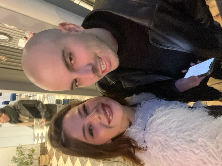 A close-up portrait shows two individuals, a female and a male, in an indoor setting in Paris, France. The female, on the left, has brown hair, wears a white fluffy jacket, and smiles directly at the camera with reddish-brown lipstick. The male, positioned on the right, has a shaved head, light facial stubble, and wears a black turtleneck under a black leather jacket. He is smiling, revealing his teeth, and holds a white smartphone in his right hand. In the background, a reflection of a third person, wearing a dark coat and scarf and holding a light-colored object, is visible in a mirrored surface. The environment features a black and white checkerboard floor, a potted plant, and a glimpse of a blue chair and other decorative elements, consistent with a hotel lobby or restaurant entrance.