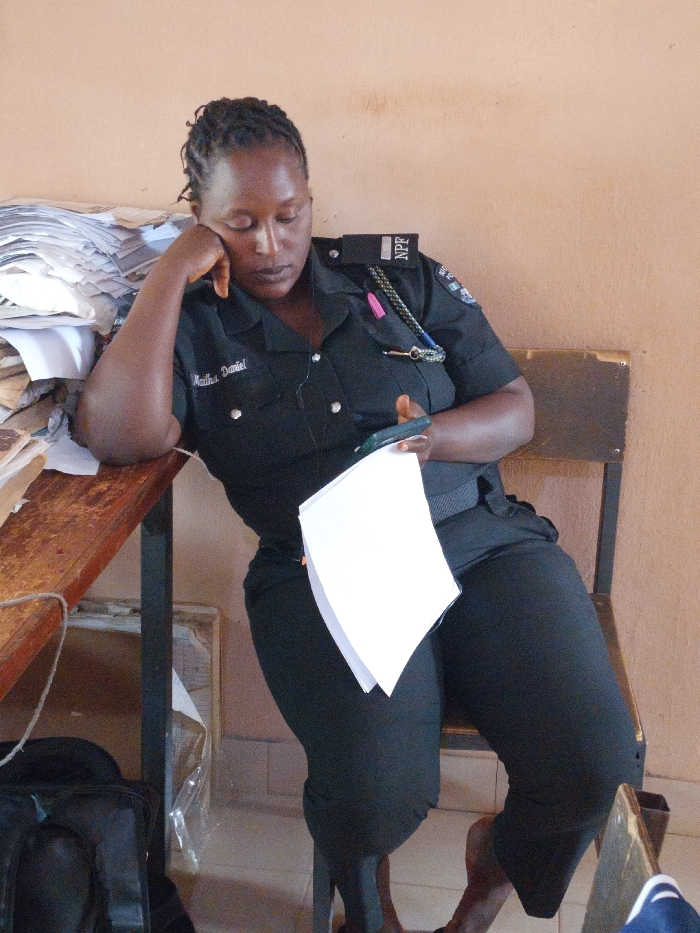 An adult female, identified as Martha Daniel by a name tag on her uniform, is seated indoors, likely within a Nigeria Police Force (NPF) facility in Kabala, Nigeria
