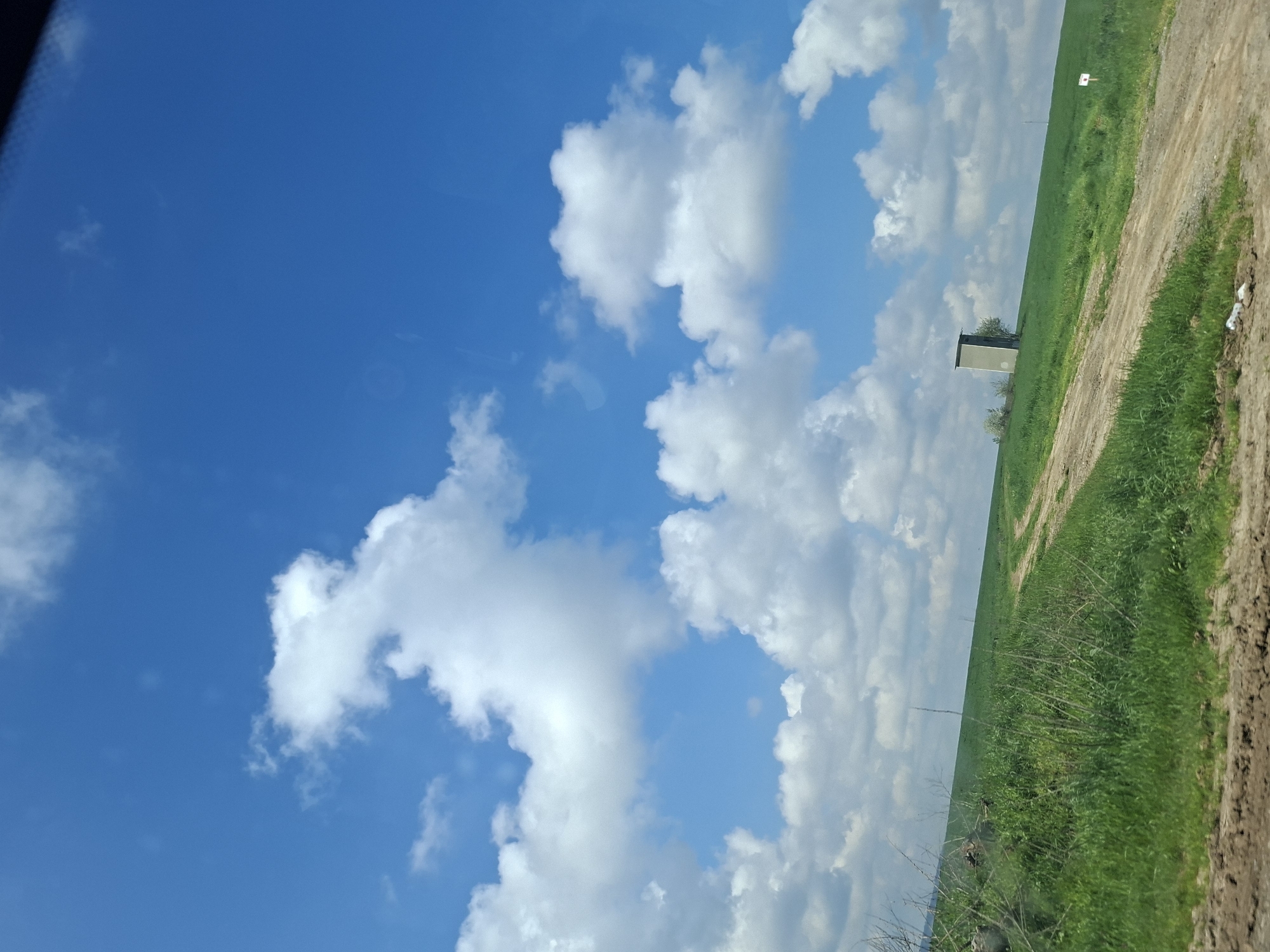 The image depicts a landscape in Polikraishte, Bulgaria, featuring a bright blue sky with scattered white cumulus clouds. The ground consists of a green grassy field bordering a dirt road. A tall, rectangular, gray concrete structure stands in the middle of the field, likely a water tower or similar utility building. A white sign is visible in the background further along the field. The foreground includes patches of dry grass and dirt along the road. The photo appears to have been taken from a low vantage point, possibly from a moving vehicle.
