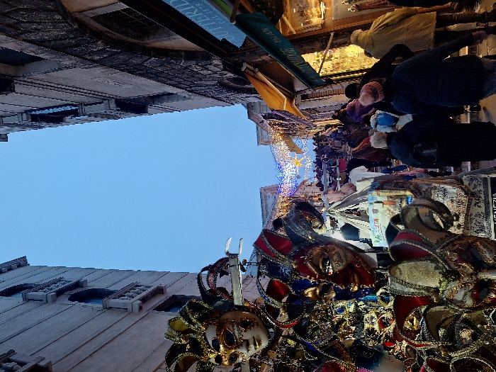 A bustling Venice street scene. Buildings line the sides of the image, framing a bright sky overhead. Many people stroll down the narrow street, browsing shops. A variety of ornate Venetian masks are prominently displayed, adding splashes of gold, red, and blue to the scene. String lights are hung over the street.
