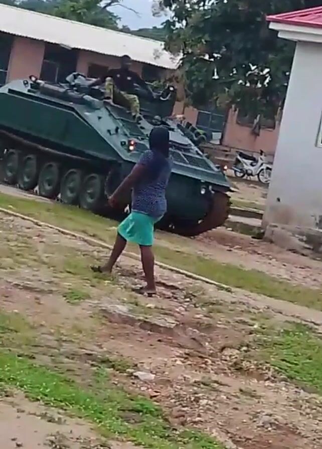 green military tank moving slowly on a dirt path near a building. Two people are sitting on top of the tank. A woman wearing a blue top and green skirt is walking nearby. The building is white with a red roof. There is also a motorcycle parked near the building. The environment appears to be outdoors, with grass and trees visible.