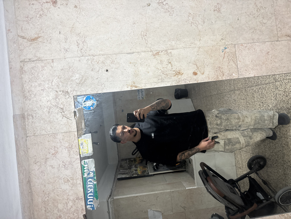The image displays a male individual capturing a selfie in a reflective surface, located within an indoor setting in Holon, Israel