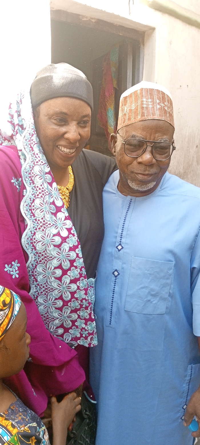 The image depicts three individuals in the city of Dan Maliki, Nigeria. An adult woman, positioned on the left, has dark skin and wears a black head covering and a black top. A magenta-colored garment with light blue floral embroidery is draped over her left shoulder and chest; she also wears a gold-colored necklace. She smiles broadly. Her left arm rests on the right shoulder of an older adult man beside her. The man, on the right, has dark skin, a white-grey beard, and wears dark-framed glasses. He is dressed in a light blue traditional tunic with dark blue geometric embroidery and a patterned light brown cap. His expression is a gentle smile, with eyes slightly downcast. Partially visible at the bottom left is a child, with dark skin, wearing a multi-colored patterned head wrap and top, facing left in profile. The man's right hand, visible at the bottom right, holds a small light blue cylindrical object. The background features a plain light-colored wall and a doorway with a dark interior where blurred, multi-colored fabrics are visible.