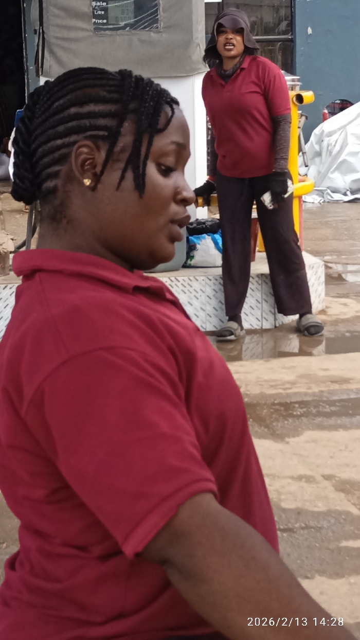 This image captures an outdoor scene at a fuel station in Lagos, Nigeria, on February 13, 2026, at 14:28