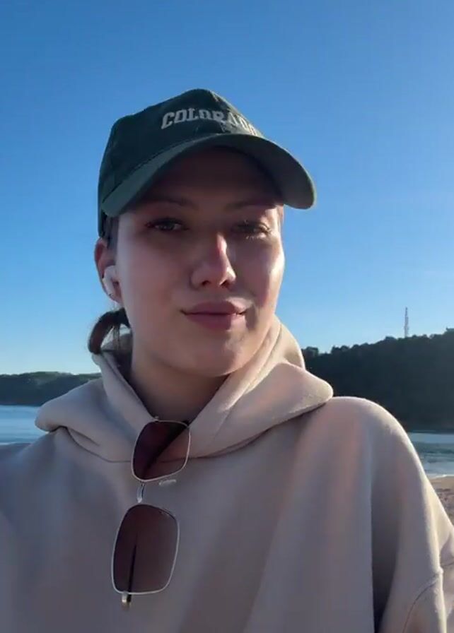 A young woman, fair-skinned, wears a beige hoodie, green baseball cap embroidered with “Colorado,” and sunglasses hanging from the hoodie. She has earbuds in her ears and stands outside, looking directly at the camera. The background includes a bright blue sky, sunshine, and a beach with the ocean. She sticks her tongue out playfully at the camera.