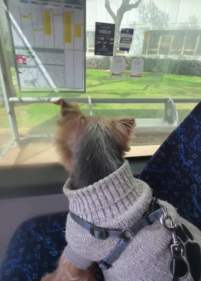 From inside a moving bus, a small dog, likely a Yorkshire Terrier, wearing a gray sweater with paw print patches and a harness, sits calmly on a seat upholstered with a blue patterned fabric