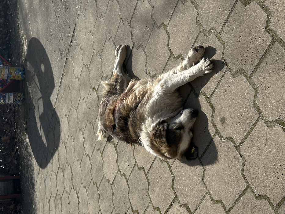 - "A large, long-haired dog with prominent brown, white, and black fur is depicted resting prone on a light gray, interlocking concrete paved surface under direct sunlight in Plovdiv, Bulgaria" by FM-PXegS2, licensed under CC BY 4.0