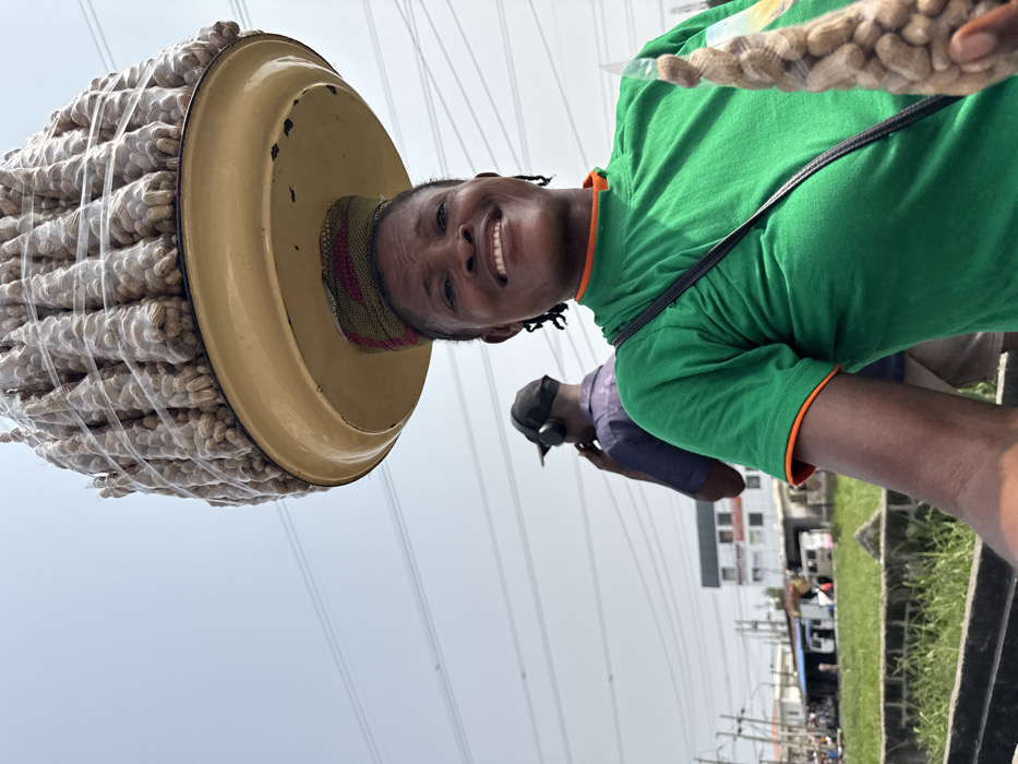 An adult female, positioned in Jakande, Nigeria, is smiling at the camera in a close-up outdoor shot. She wears a green t-shirt with orange trim and has a black strap diagonally across her chest. On her head, she balances a large, light-yellow metal tray, cushioned by a patterned fabric band. The tray supports a tall, cylindrical display composed of numerous individual clear plastic bags, each filled with shelled peanuts. Her right hand extends forward, holding one such bag of peanuts. In the mid-ground behind her, a male figure wearing a dark shirt, black baseball cap, and headphones is partially visible, facing away from the camera. The background features a hazy sky with multiple power lines, and distant urban elements including buildings, smaller structures, vehicles, and areas of green vegetation and concrete barriers.