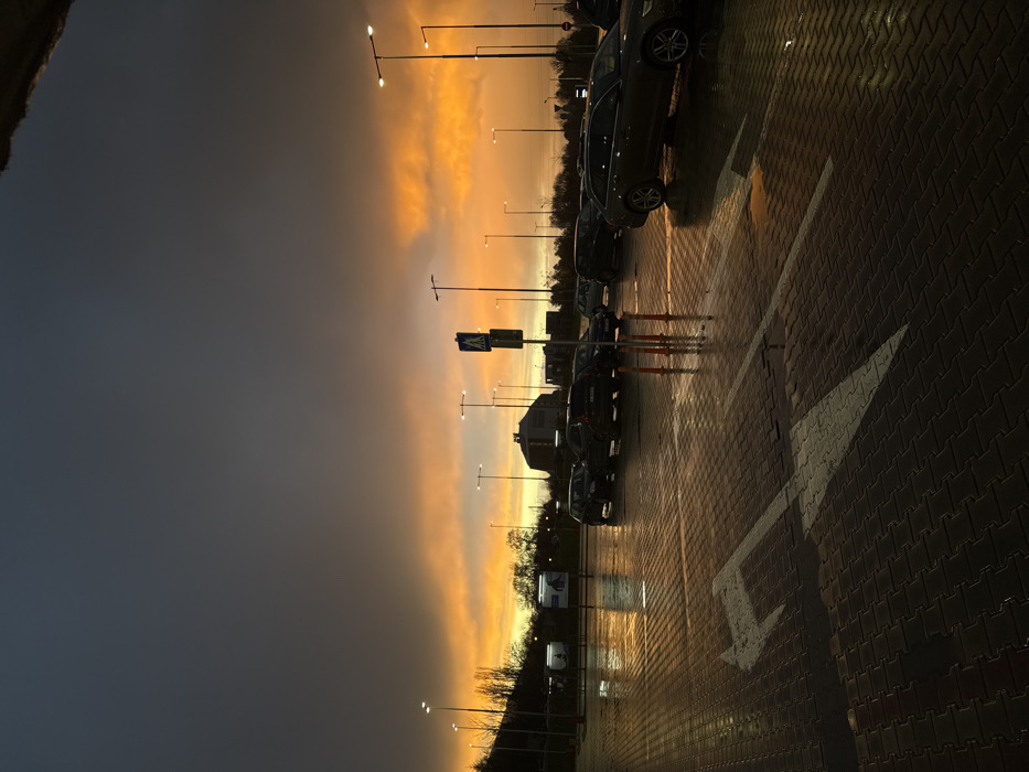 This image depicts a large, wet commercial parking lot in Sofia, Bulgaria, at dusk. The specific location is identified as the parking area of the Kaufland hypermarket on Tsarigradsko shose Blvd. The sky above is dominated by dark grey, heavy clouds, while the lower horizon is illuminated with vibrant orange and yellow hues from the setting sun. The ground, paved with dark grey interlocking bricks, is thoroughly wet, showing numerous puddles and highly reflective surfaces that mirror the sky and artificial lights. Several objects are present: * **Vehicles:** Approximately 10-15 passenger cars, predominantly dark-colored sedans and station wagons, are parked or idle in the mid-ground. A dark grey Audi A6 Avant is prominent in the foreground on the right side. * **Lighting:** Multiple tall streetlights with illuminated white lamps are active throughout the scene, casting reflections on the wet pavement. * **Signage:** A blue square pedestrian crossing sign, featuring a white walking figure, stands on a pole near the center of the frame. * **Traffic Control:** Three orange traffic cones are clustered near the base of the pedestrian sign. * **Ground Markings:** White painted directional arrows, indicating a right turn, are visible on the wet pavement in the immediate foreground. * **Buildings:** In the background, behind a line of bare trees, the dark facade of the large Kaufland hypermarket building is partially visible, characterized by its commercial architecture. Other indistinct buildings are visible on the distant horizon. * **Vegetation:** Leafless deciduous trees and some evergreen shrubs are situated on a gentle slope to the left of the parking lot. No people are visible in the scene. The wet environment suggests recent rainfall. The illuminated streetlights combined with the sunset indicate the transition from late afternoon to early evening.