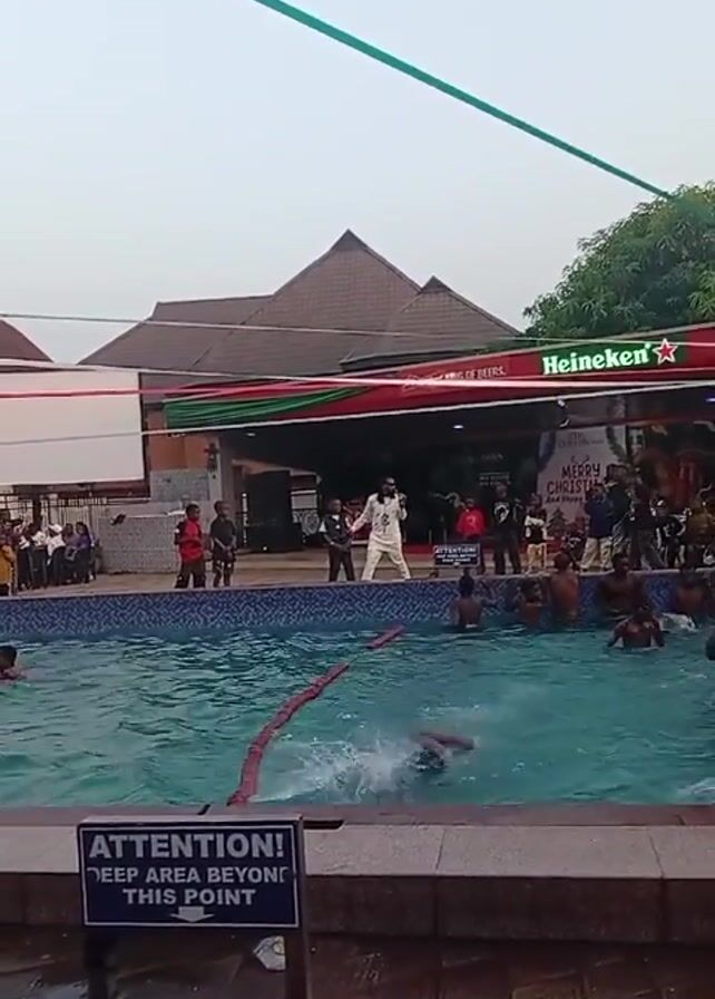 A low-angle shot shows a swimming pool with people swimming in it. A sign reads "ATTENTION! DEEP AREA BEYOND THIS POINT." On the pool deck, a man in white clothing stands in front of a crowd. The background features a building decorated with red, green, and white streamers and a Heineken sign.