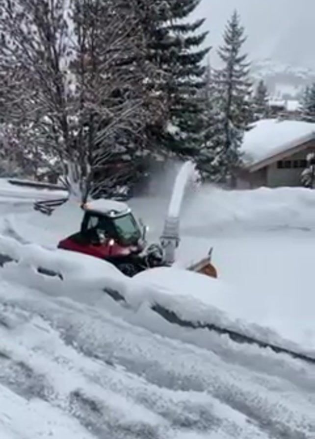 A red tractor-like vehicle with a snowblower attachment clears a snow-covered driveway