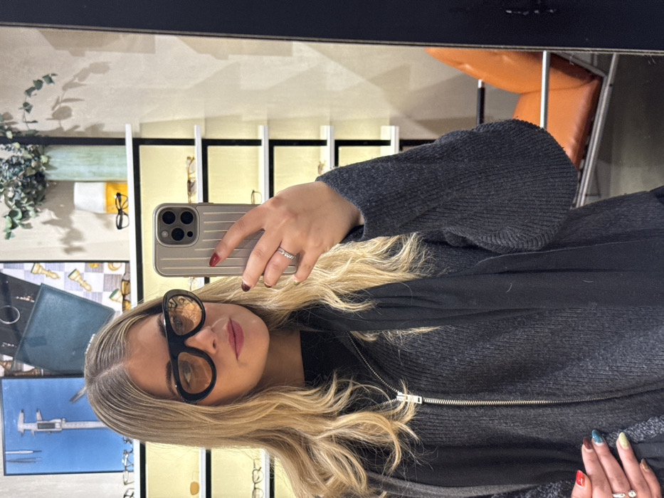 A woman with blonde hair and black glasses poses, holding a silver phone. She wears a gray sweater and a black scarf or jacket. The background features a mirror reflecting a room with shelves displaying eyeglasses, decorative plants, and an orange chair. The phone's case is metallic, and the woman wears a ring. Her nails are painted in different colors on each hand.