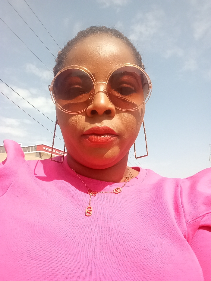 A close-up outdoor portrait shows an individual with dark skin, wearing large, round, gold-rimmed sunglasses with tinted lenses and red lipstick
