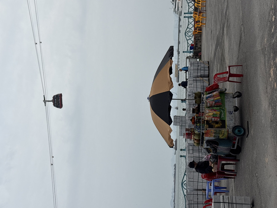 This image captures an outdoor waterfront scene in Bai Chay Ward, Vietnam, under an overcast sky. In the upper portion of the frame, a red and black cable car gondola is visible, suspended by multiple overhead cables that stretch horizontally across the sky. Smaller, less distinct cable car carriers are also apparent further along the cables. The mid-ground is dominated by a mobile vendor cart, positioned slightly left of center on a dark, uneven paved surface. A large, two-toned umbrella with alternating black and tan segments shades the cart. The cart displays an assortment of merchandise, including several green coconuts, various bottled drinks, and numerous colorful packages of snacks. Bags are suspended from the cart's side. A single individual, wearing a dark jacket and a dark cap, is seated on a red plastic chair to the left of the vendor cart, facing right. Their hands rest on a small blue plastic table positioned next to the chair. An empty red plastic chair stands to the right of the vendor cart. Behind the vendor area, neatly stacked rectangular, light-colored blocks form a structured barrier or storage arrangement. Beyond these stacks, a body of water, likely a bay or harbor, extends into the background. Several vessels are present on the water: multiple large cargo ships or barges are visible in the distance to the left, and a prominent white, multi-deck ferry or cruise ship is docked or moving near a pier on the far right. A decorative waterfront railing, featuring light blue and white elements, separates the paved area from the water. Two additional individuals are seen near this railing; one in dark clothing and another in a light blue top, both facing the water. Further to the right, a cluster of yellow plastic chairs and small tables occupies the paved area.