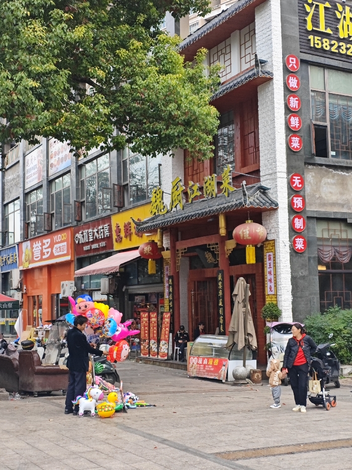 This image depicts a bustling commercial street scene in Bishan, China, characterized by a mix of traditional and modern storefront architecture under an overcast sky. In the foreground, a paved street or pedestrian area occupies the lower half. On the far left, a man in a dark jacket stands next to a cluster of brightly colored, helium-filled balloons, including character shapes like a unicorn, a duck, and other卡通 figures, attached to a wheeled cart. Smaller deflated balloons and toys are arranged on the ground around the cart. To the immediate left of the balloon vendor, a worn, brown upholstered armchair and other miscellaneous items are stacked. On the right side of the foreground, a woman wearing a black jacket with a red lining and black pants walks forward, holding the hand of a small child dressed in a beige jacket and pants. A dark-colored stroller is positioned behind the woman. A dark scooter is parked further right, partially obscured by foliage. The background is dominated by a row of multi-story commercial buildings. The most prominent building, on the right, features a white brick facade with dark brown wooden accents and a traditional Chinese-style entrance with a dark tiled roof and red columns. Two red lanterns hang from this entrance. A golden sign above the entrance reads "魏厨江湖菜" (Wei Chu Jianghu Cuisine). A vertical red sign on the building's corner states "只做新鲜菜,无预制菜" (Only fresh dishes, no pre-made dishes). Higher up, a yellow sign displays "江油" and a phone number (158232...). Outside this restaurant, a folded beige outdoor parasol stands near a red-and-white refrigerated display cart. Two men are seated outside the entrance in the background. To the left of this building, a row of more modern commercial buildings features large windows. Storefronts with orange, yellow, and black facades are visible, displaying various Chinese signs including "YUDUO (优朵)" and "永利大药房" (Yongli Pharmacy). A large, leafy green tree partially obscures the upper left portion of the buildings.