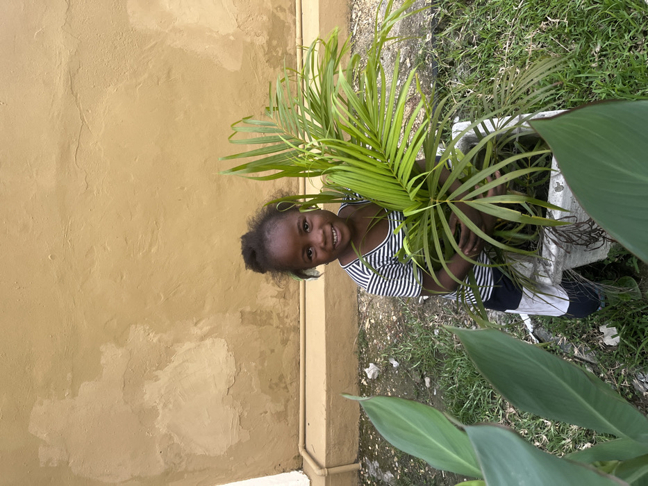 A smiling child stands next to a potted palm, posing near a light yellow stucco wall and patches of green grass