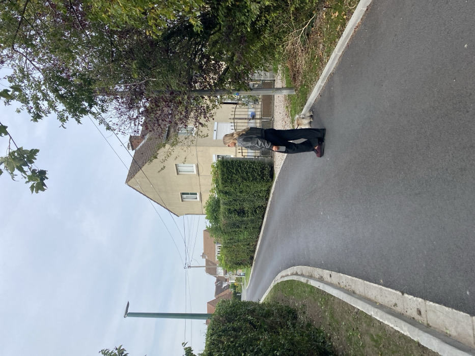 An outdoor image depicts a residential street in Wattrelos, France, under an overcast sky. A blonde female, seen from behind, walks on the right side of a freshly paved, dark asphalt road. She wears a dark grey bomber jacket, black wide-leg trousers, and dark red shoes, holding a clear plastic bottle in her left hand. A small, light-colored fluffy dog walks slightly behind and to her right. The road features new concrete curbing and grassy verges. Along the left side of the road, a long, trimmed green hedge separates the street from a narrow grassy strip and distant residential houses. A dark green street lamp post is visible on the left. On the right, a similar green hedge fronts a light beige two-story house with a brown tiled gable roof, white-framed windows, and a dark metal gate. A large tree with green and reddish-purple foliage partially obscures the right foreground, and a utility pole with overhead lines stands near the house.