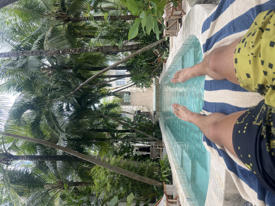 A person sits by a narrow plunge pool, legs stretched out, feet dangling in the water. They wear patterned shorts and rest on a blue and white striped towel. Lush palm trees surround the pool area, creating a tropical setting. A white building with stairs is visible in the background between the trees. The scene suggests relaxation and vacation.