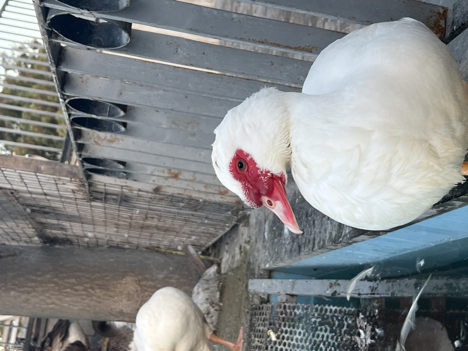 - "A white Muscovy duck, distinguished by its red caruncles around a dark eye and a pinkish-red bill, occupies the right foreground, facing left" by FM-NiDCC3, licensed under CC BY 4.0