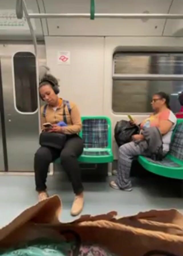 The inside of a train car is shown. There are three people visible. A woman on the left is sitting with her head down, looking at her phone. She is wearing a tan-colored sweater, black pants, and tan shoes. She has headphones on. A woman on the right is sitting and looking at her phone as well. She has on glasses and a tie-dye shirt. There are green and patterned chairs and hand rails above. Large shopping bags are in the foreground.