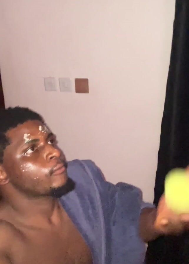 A man is tossing a tennis ball in the air and catching it. The man is shirtless and wearing a blue towel around his shoulders. He has a beard and what appears to be a white substance on his face. He is looking up at the ball as he tosses it. The background is a white wall with a few light switches and a dark curtain on the right side. A dark wooden door with gold accents is visible behind the curtain.