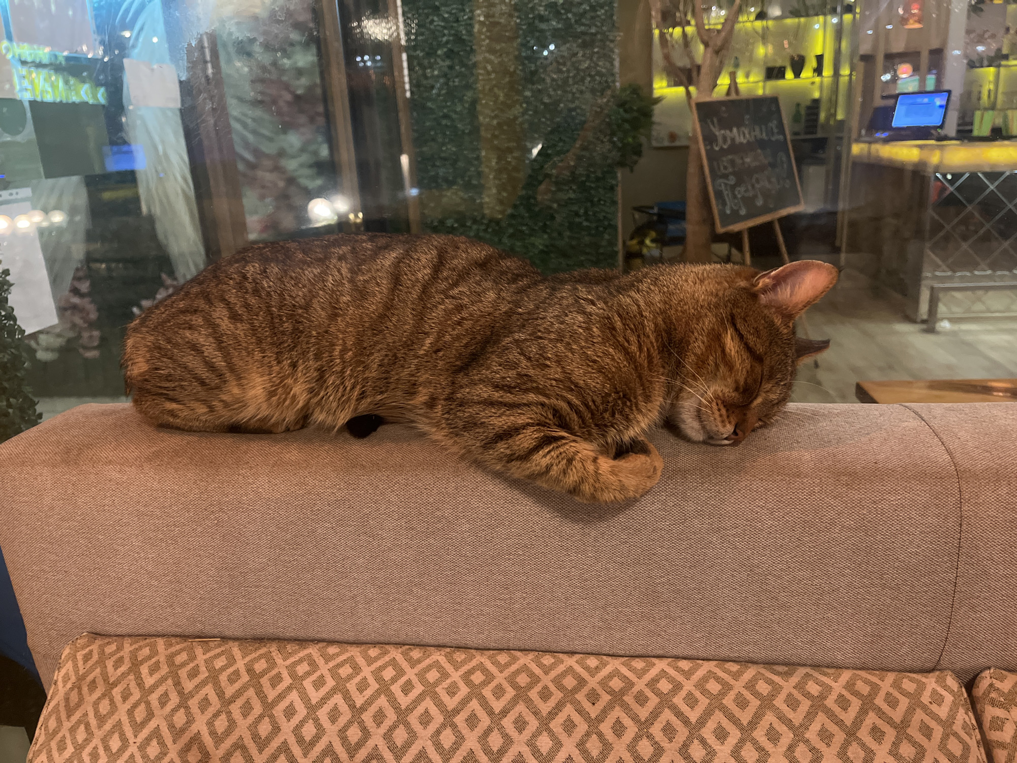 A brown tabby cat is sleeping on a beige upholstered couch. The couch has a patterned cushion below. Behind the cat, through a window, is a view of a restaurant or cafe interior. A chalkboard with writing in Cyrillic and a lighted bar or counter are visible. This is likely a cafe in Gabrovo, Bulgaria.