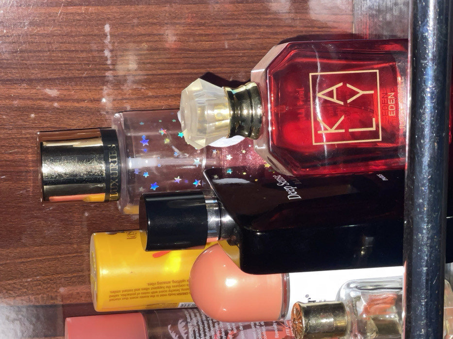 The image presents a close-up, static indoor scene displaying an assortment of cosmetic and fragrance bottles. No individuals are present, and no actions or interactions are depicted. The background consists of a dark brown wooden surface exhibiting vertical grain, with various small white particles or dust specks visible. A dark, horizontal bar or shelf edge occupies the bottom of the frame. Multiple bottles are arranged on this surface. From left to right: A partially visible pink-red bottle or can with white label text is at the far left. Next to it, a yellow cylindrical bottle with a white label displaying black text, including "body mist" and "pistachio," is prominent. In front of the yellow bottle is a white cylindrical bottle with a glossy orange, spherical top. Towards the center, a clear plastic spray bottle containing a dark liquid and iridescent star-shaped glitter stands. Its gold-colored cap is inscribed with "LUXURIES." Adjacent to this, a dark, possibly black, angular glass bottle with a black cap and silver band is positioned. A white label on its side reads "Deep Sense BLACK" and "PARIS." On the right, a clear red, multi-faceted glass bottle is prominently displayed. It features a clear faceted stopper, a gold-colored neck, and a gold-outlined square on its front containing the gold letters "K A L Y." Smaller text "La Feniel," "EDEN," and "JUICY APPLE" are partially visible below "KALY." A small, clear glass bottle with a gold-colored cap is partially visible at the bottom left foreground.