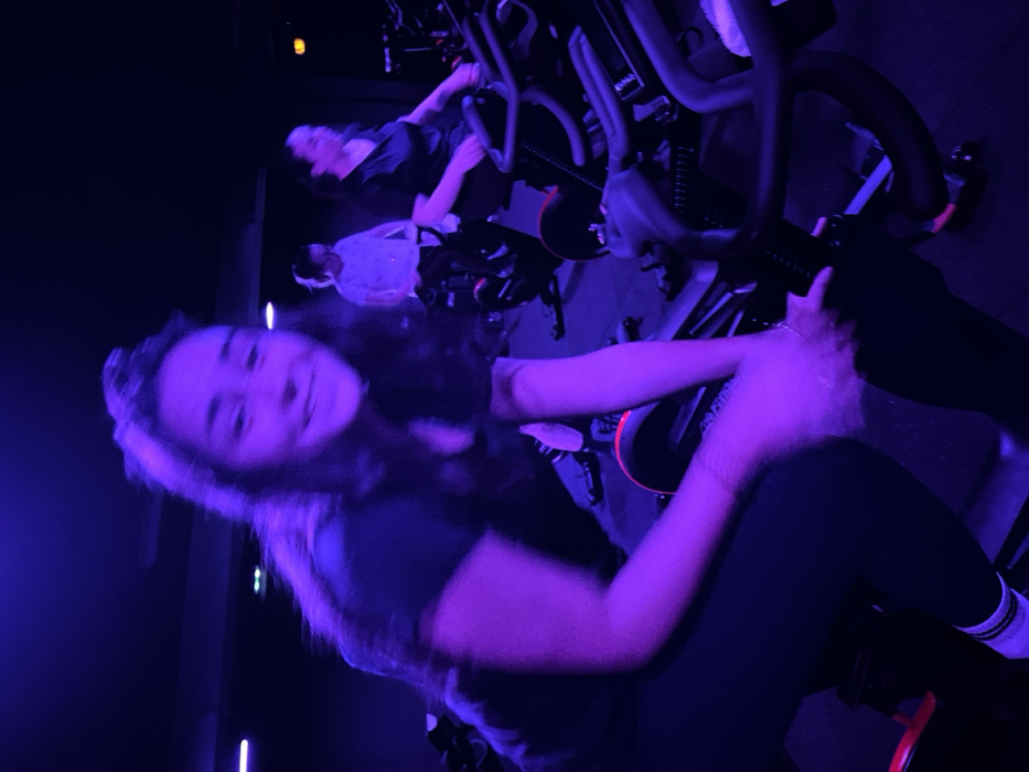 A brightly lit indoor cycling studio shows three participants on stationary bikes. In the foreground, a young woman sits on her bike, smiling with her hand in her hair. She wears leggings and white striped socks. Two other cyclists are visible in the background, though slightly out of focus. The overall lighting is purple.
