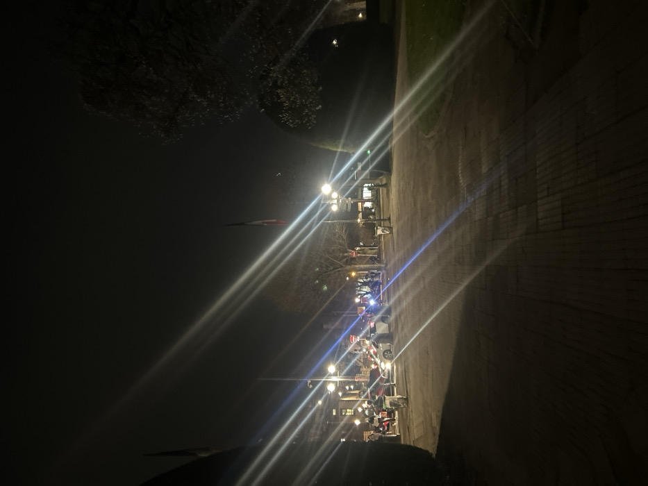 A night view shows a line of streetlights casting long beams across a paved walkway. Parked motorcycles and what appears to be outdoor seating line the side of the path. Trees are visible on either side, one silhouetted in the dark background. A flag is slightly visible, illuminated by the lights. The scene is dark, but the streetlights create bright streaks and highlights.