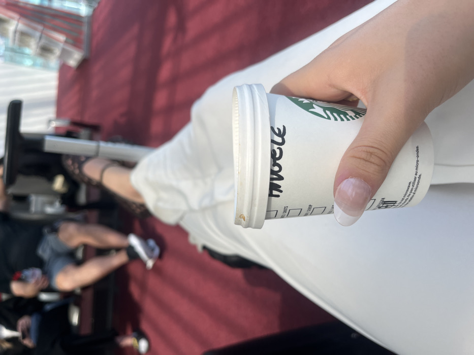 A person is sitting on a white chair, holding a Starbucks coffee cup. The cup has the name "Moele" written on it in black marker. The person is wearing white pants. Their right hand is holding the cup, their thumb is resting on the side of the cup, and their index finger is extended, resting on the top of the cup. Their left leg is extended in front of them, and their left foot is resting on the floor. The chair is in a public space, likely an airport or train station, as the red carpet floor is indicative of such locations. The background is out of focus, but it appears to be a crowded public space with people sitting and walking around. The location is Roissy-en-France, France, based on the provided coordinates.