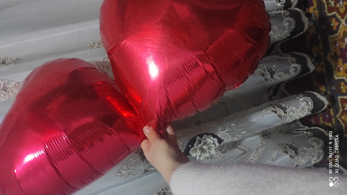 Two heart-shaped, red foil balloons rest on a surface adorned with white lace fabric. The balloons appear connected. A hand, clad in a light-colored sweater, lightly touches the balloons. The background includes a glimpse of patterned flooring. The image has a timestamp or watermark-like text in the lower right corner, indicating a camera model. The setting suggests a festive or celebratory occasion.