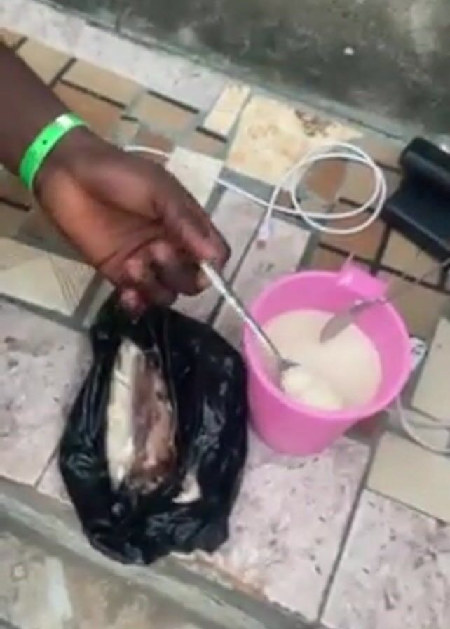 A young man is shown in a video next to what appears to be fish in a black bag and a pink bucket containing a white liquid. He uses a spoon to take some of the white liquid and puts it on the fish. The surroundings suggest an outdoor, possibly urban, setting. The man appears to be preparing something to eat.
