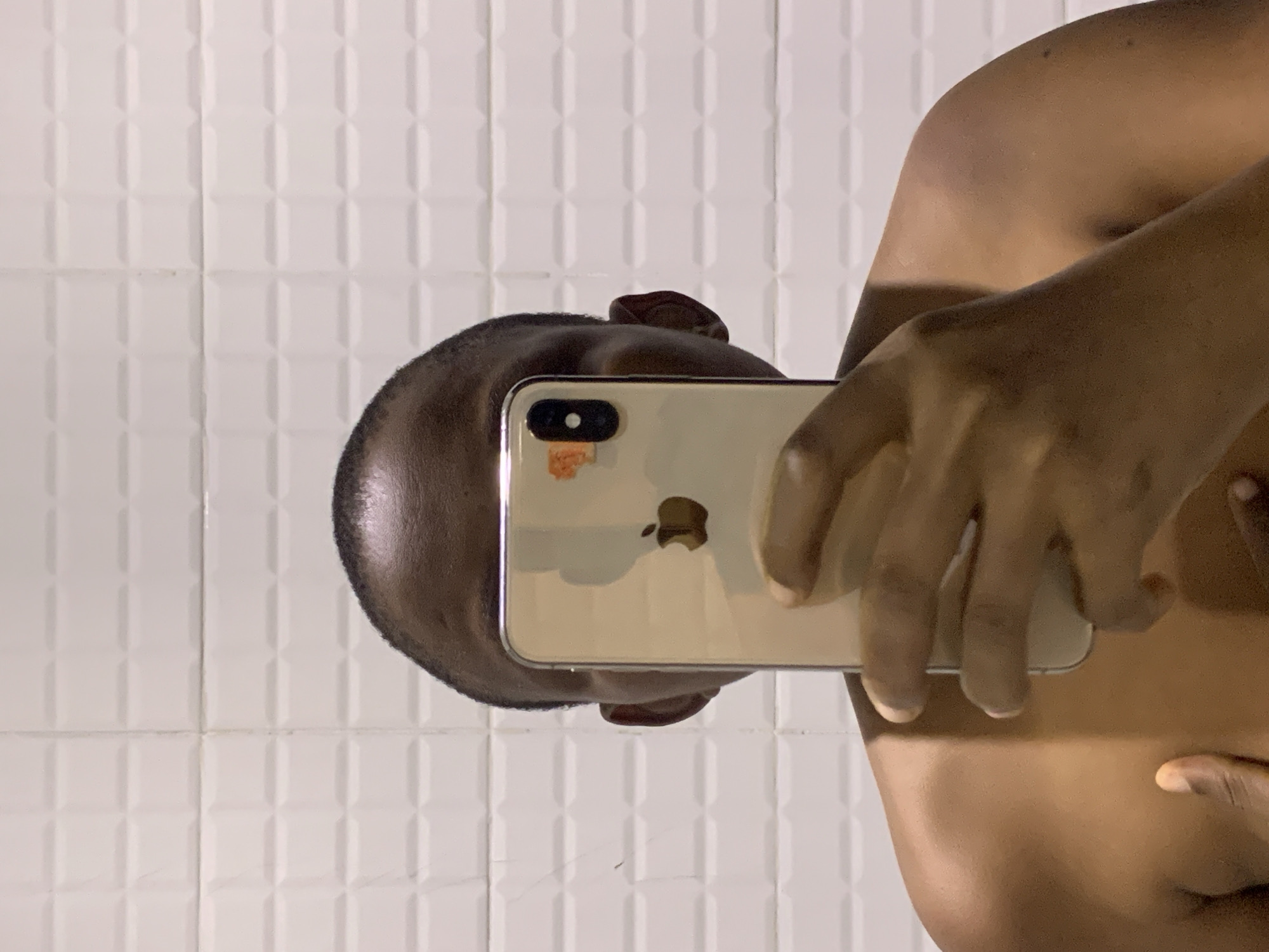 An individual stands against a white tiled wall with a grid of raised rectangular patterns, indoors in Moba, Nigeria. The person's facial features from the eyes down are entirely obscured by a vertically held gold-colored iPhone. The rear of the iPhone, displaying the central Apple logo, the upper-left dual camera module, and a small, partially obscured orange sticker, faces the viewer. The person's right hand grips the phone, while their left hand is partially visible resting on the lower left chest area. The individual has dark skin and closely cropped dark hair, with their bare upper torso and shoulders visible.