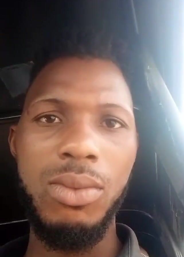 The video features a dark-skinned man with a beard and short hair, wearing a dark shirt and a gold necklace with a cross. He is looking directly at the camera, with slight movements of his head. He appears to be inside some sort of vehicle with a black interior. The background is mostly bright white, possibly due to sunlight. Another person is briefly visible at the bottom of the frame. There's loud music playing in the background.