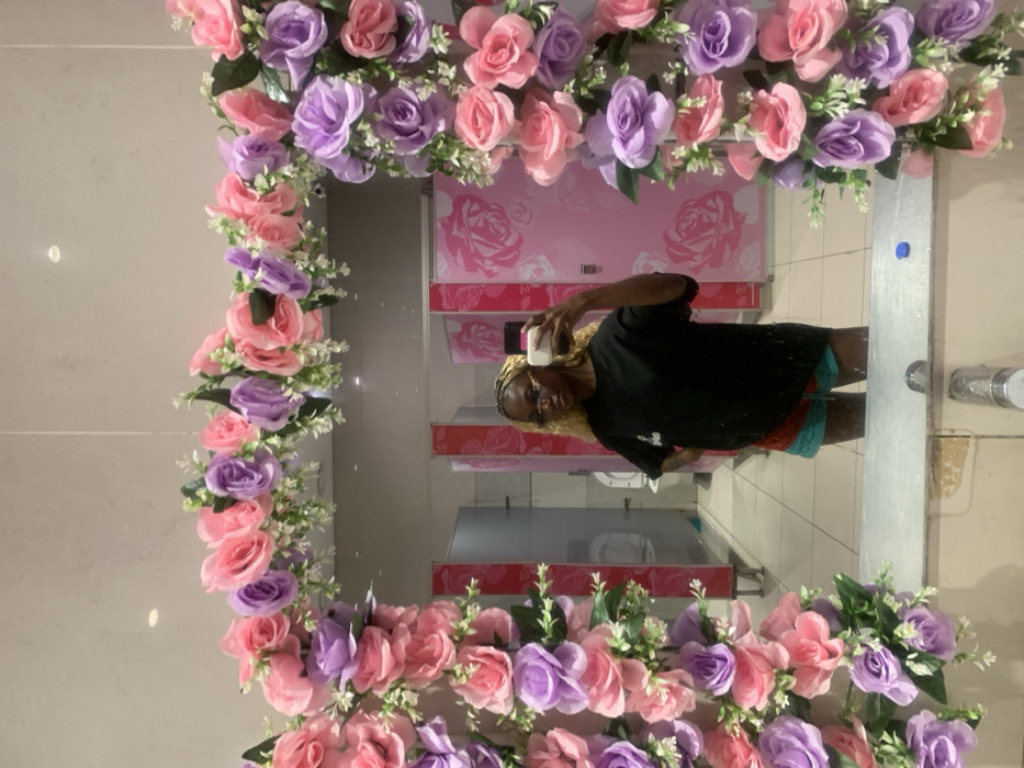 An individual, identified as a young Black female, is depicted taking a mirror selfie within the Ladies' restroom at Maryland Mall, Lagos, Nigeria. She has long, blonde, wavy hair and wears an oversized black t-shirt, multi-colored shorts (turquoise, red, white), and gold-rimmed glasses. Her right hand holds a smartphone with a white case, pointed towards the mirror. The mirror is prominently framed by an archway of artificial pink and purple roses, interspersed with green foliage. In the reflection, several restroom stalls are visible; some are plain grey, while others feature a distinct pink color with large rose patterns. The lower portion of the image shows a light-colored countertop with a metallic faucet fixture, displaying minor wear and staining, and a tiled floor. Overhead lighting illuminates the scene.