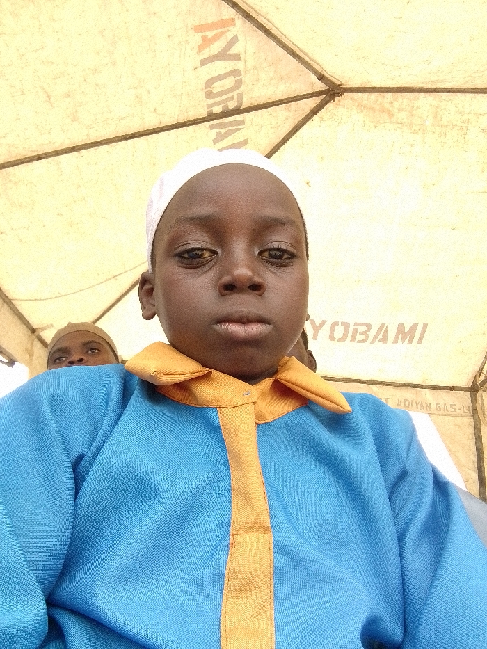 - "A frontal, close-up image captures a child, appearing to be of primary school age, with dark skin, wearing a white kufi cap and a blue long-sleeved garment with an orange pointed collar and a central orange strip" by FM-v0asx1, licensed under CC BY 4.0