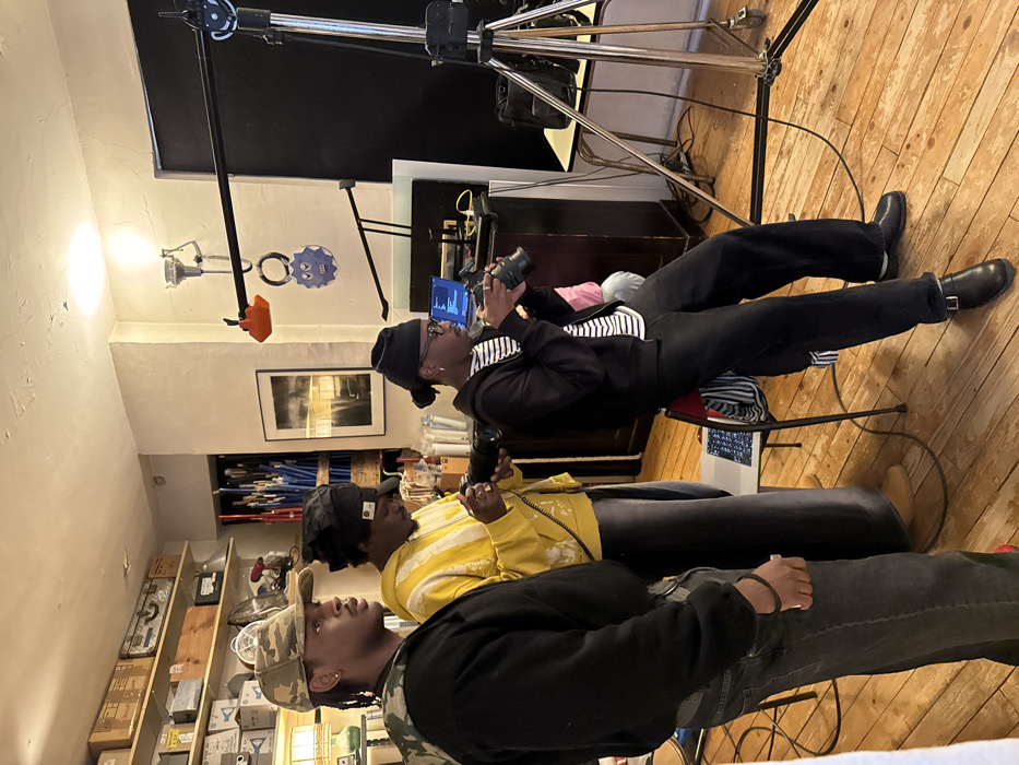 The image depicts an indoor studio or workshop space located in Paris, France. Three individuals are present, all appearing male. On the far left, a man wearing a camouflage-patterned cap, a black hoodie, and dark jeans stands in profile, looking towards the right. In the center, a man wearing a black beanie, a yellow and white patterned hoodie, and dark wide-leg trousers stands, holding a professional camera with a substantial lens, focusing on its controls. To his right, a third man, wearing a black beanie, eyeglasses, a black zip-up hoodie over a white and black striped shirt, and dark wide-leg trousers, is seated on a red-framed stool. He also holds a professional camera with a lens, examining its settings. The environment features light-colored walls and a wooden floor. In the background, shelving unit holds various boxes and containers, alongside a wall-mounted light fixture and a framed dark art piece. A large studio tripod stands on the right, and an articulated arm extends from the wall, suspending an orange object and a blue circular emblem. A laptop displaying lines of code or text is visible on a low surface near the seated individual. All three individuals appear engaged in photographic or videographic activity within a professional or creative setting.