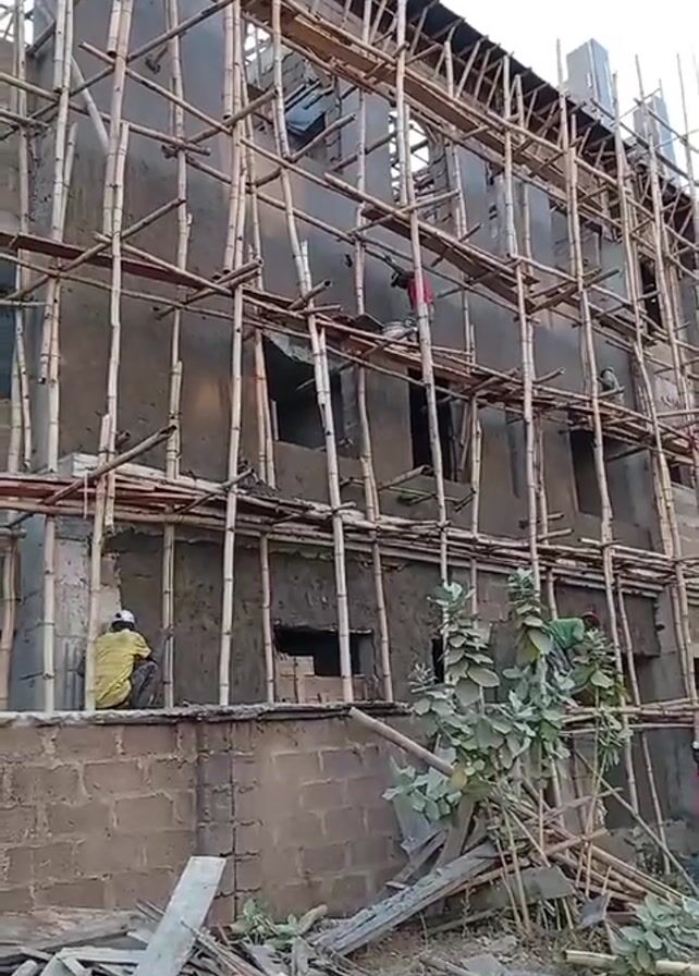 three-story building under construction. The building is surrounded by a bamboo scaffold. Several construction workers are visible on the scaffold, working on the building's exterior. One worker, wearing a yellow shirt, is working on the lower level, while another worker, wearing a red shirt, is higher up on the scaffold. Debris, including wooden planks, litters the ground around the building. A few small trees or bushes are also visible in the foreground.