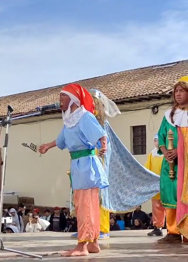 On an outdoor stage, a group of people are dressed in what appears to be costume attire. The person farthest to the left wears a red head covering and a light blue top with peach-colored pants, no shoes. The person speaks into a microphone while standing on a stage. Another person dressed in green, orange, and yellow with a yellow head covering stands nearby holding a staff-like object. A younger person in a blue outfit also stands on the stage. Members of the audience sit and watch the performance. The building behind the stage has a brown, tiled roof. The sky is blue with some cloud cover.