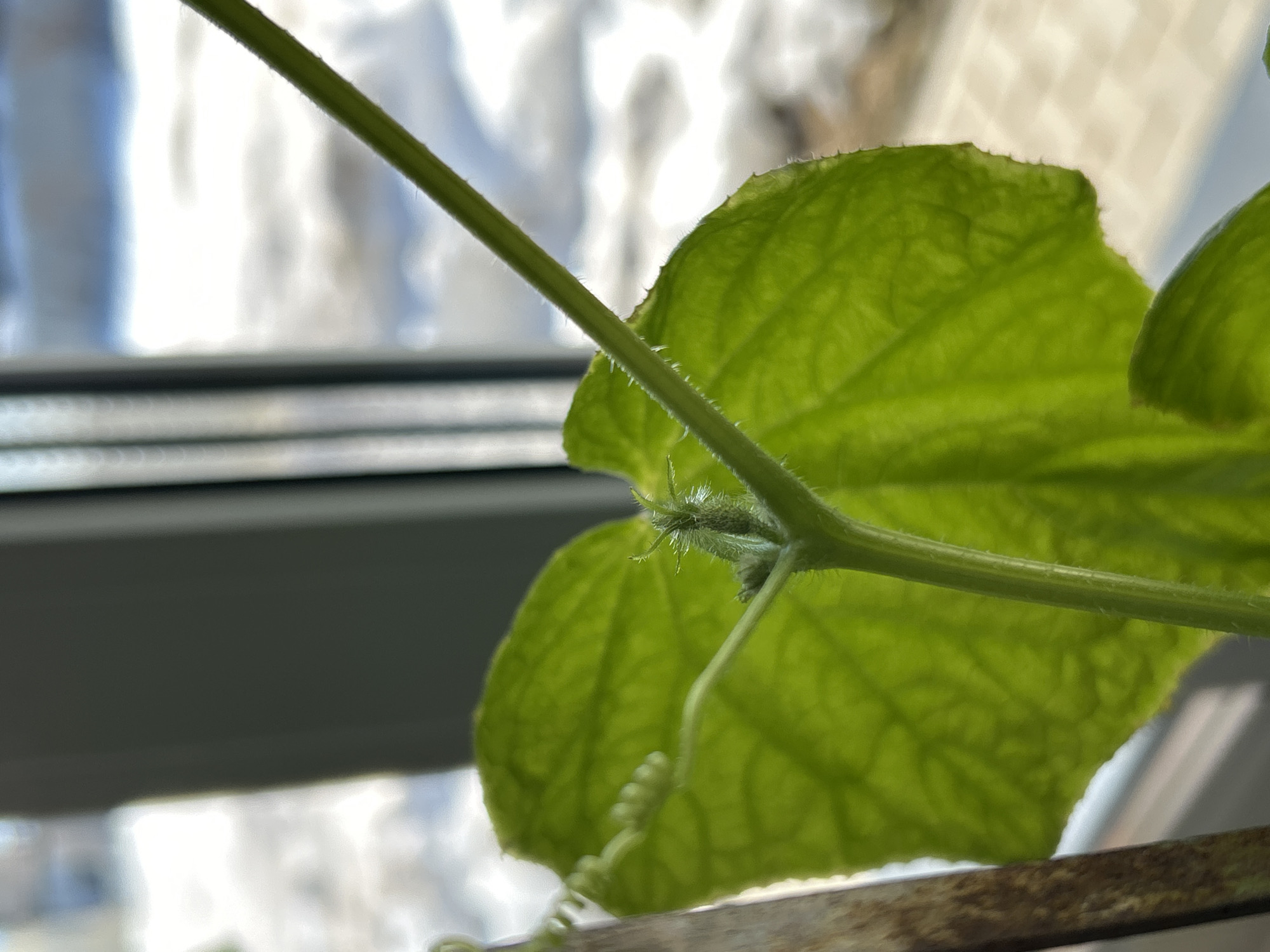 close-up of a plant, likely a cucumber or similar vine, growing indoors, possibly near a window