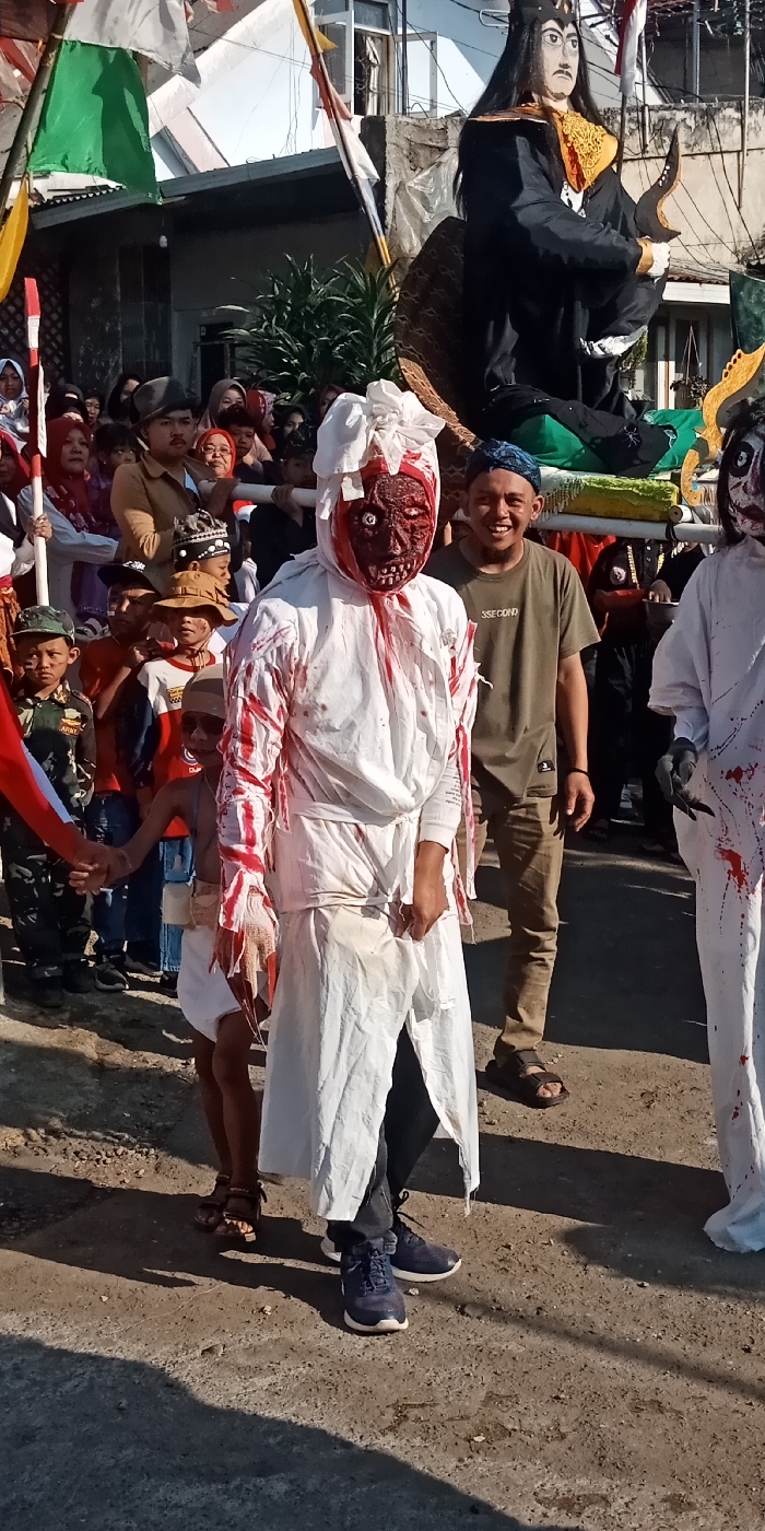 A street scene in Ciherang, Indonesia, depicts a public procession under direct sunlight