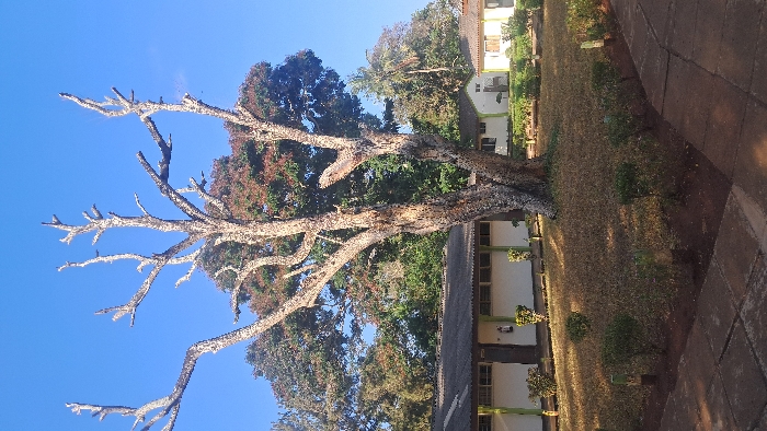A wide-angle outdoor shot displays a large, bare tree dominating the scene. Its branches, devoid of leaves, stretch towards a bright blue sky. Behind the tree, lush green trees and foliage add depth, partially obscuring a building with light-colored walls and dark window frames. The ground is covered in dry grass and small shrubs. A dark, paved walkway extends from the bottom right, angling towards the building. The scene suggests a park or campus setting.