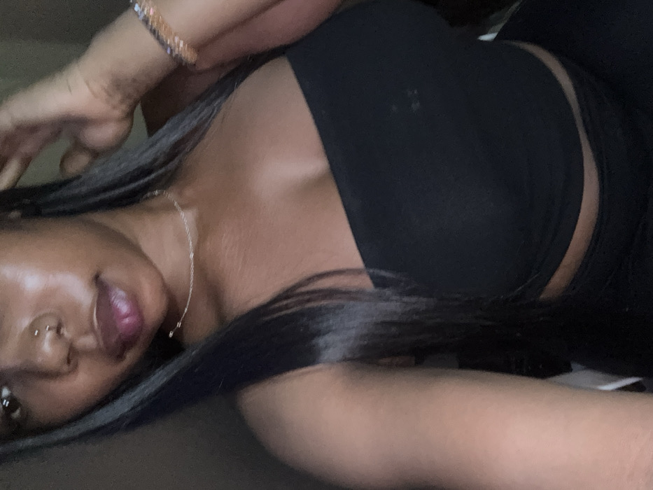 A woman is lying on her side, wearing a black tube top. She has dark skin, long, straight black hair, and a nose piercing. She wears a silver necklace and a beaded bracelet. The photo is taken at a close range, focusing on her face and upper body. The lighting is subdued, creating a soft contrast on her skin.