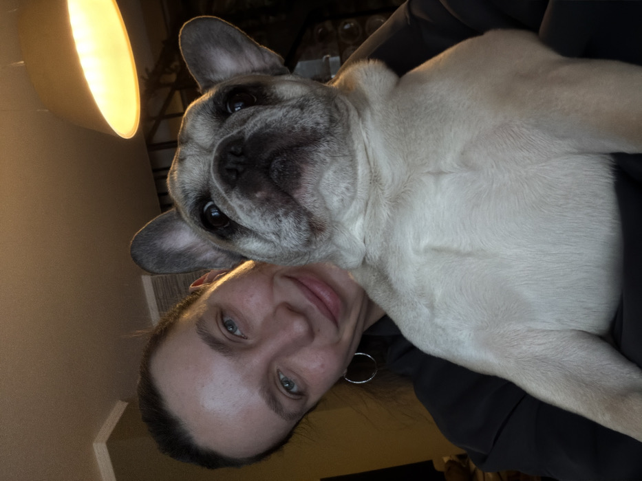 - "A woman with light skin and blue eyes is pictured in a selfie with her French Bulldog" by FM-mkWXI3, licensed under CC BY 4.0